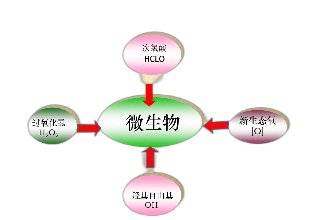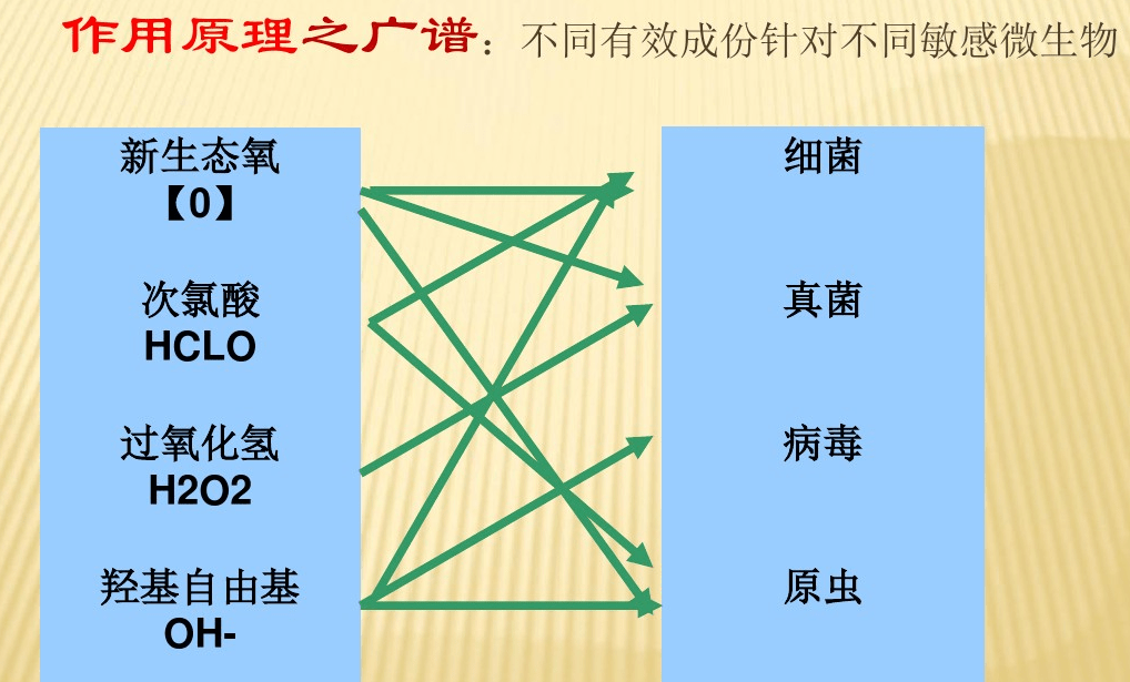 在整個鏈式反應中,生成的反應物質過氧化氫、次氯酸、新生態氧、羥基自由基均可以對微生物產生殺滅作用,多重殺菌,高效。而且四種產物對環境幾乎沒有汙染、其腐蝕性弱,使用安全,對金屬製品幾乎無腐蝕性,產品在水溶液中可全部降解,對動物無刺激性、無毒性、無三致性,是可以飲水消毒的91看片免费下载之一。